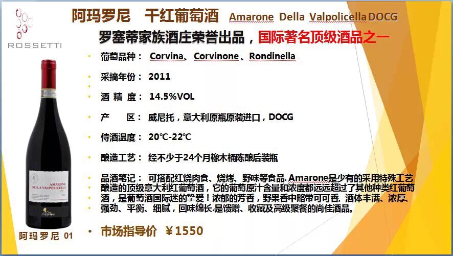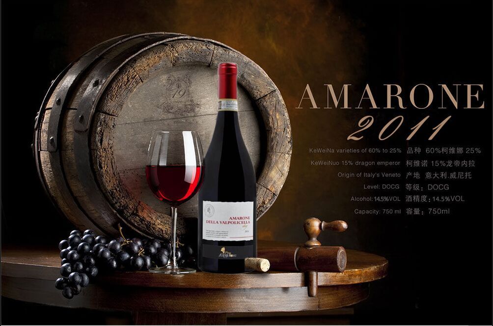 6、阿马罗尼(Amarone):是一种来自威尼托的葡萄酒类型,通常采用科维纳(Corvina)、罗蒂内拉(Rondinella)和莫利纳拉(Molinara)葡萄混酿而成,酿造前,部分葡萄需要晾干,酿造的葡萄酒馥郁,高酒精度,收尾带有甜味。