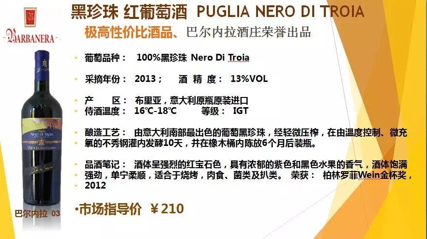 11、黑珍珠NERO DI TROIA黑珍珠。产自意大利南部普利亚产区,黑珍珠葡萄酒,酒色深宝石红色,具有紫色和黑色水果的香气,酒体饱满强劲,单宁柔顺。是款闻名的高性价比酒品
