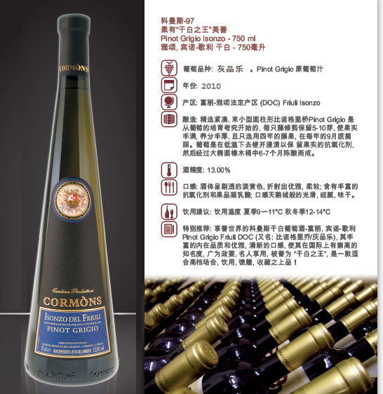 12、灰皮诺(Pinot Grigio):最受欢迎的意大利白葡萄品种,源自法国,在法国称为“Pinot Gris”。实际上,灰皮诺由黑皮诺变异而来,灰皮诺的果皮颜色为浅粉红色。此品种的主要种植区域为特伦托、弗留利.