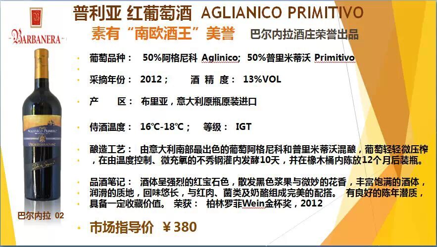 8、普里米蒂沃(Primitivo)、阿里尼科(Aglianico):两种来自意大利南部的葡萄品种,其混酿酒品素有“南欧酒王”之美誉。